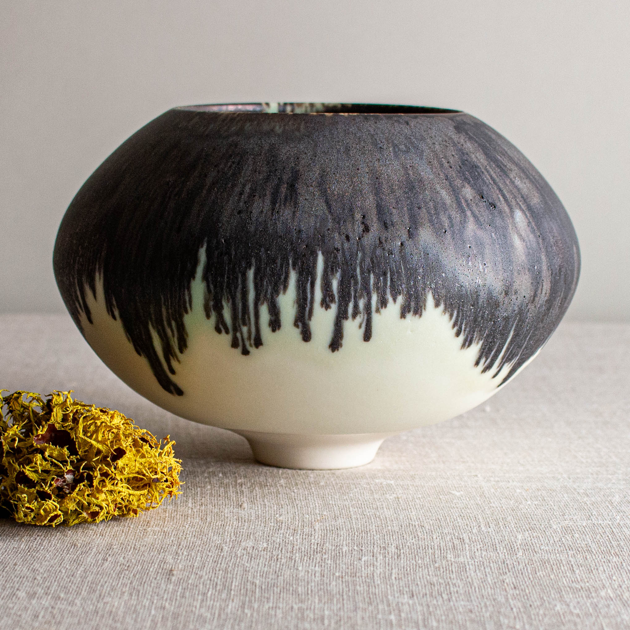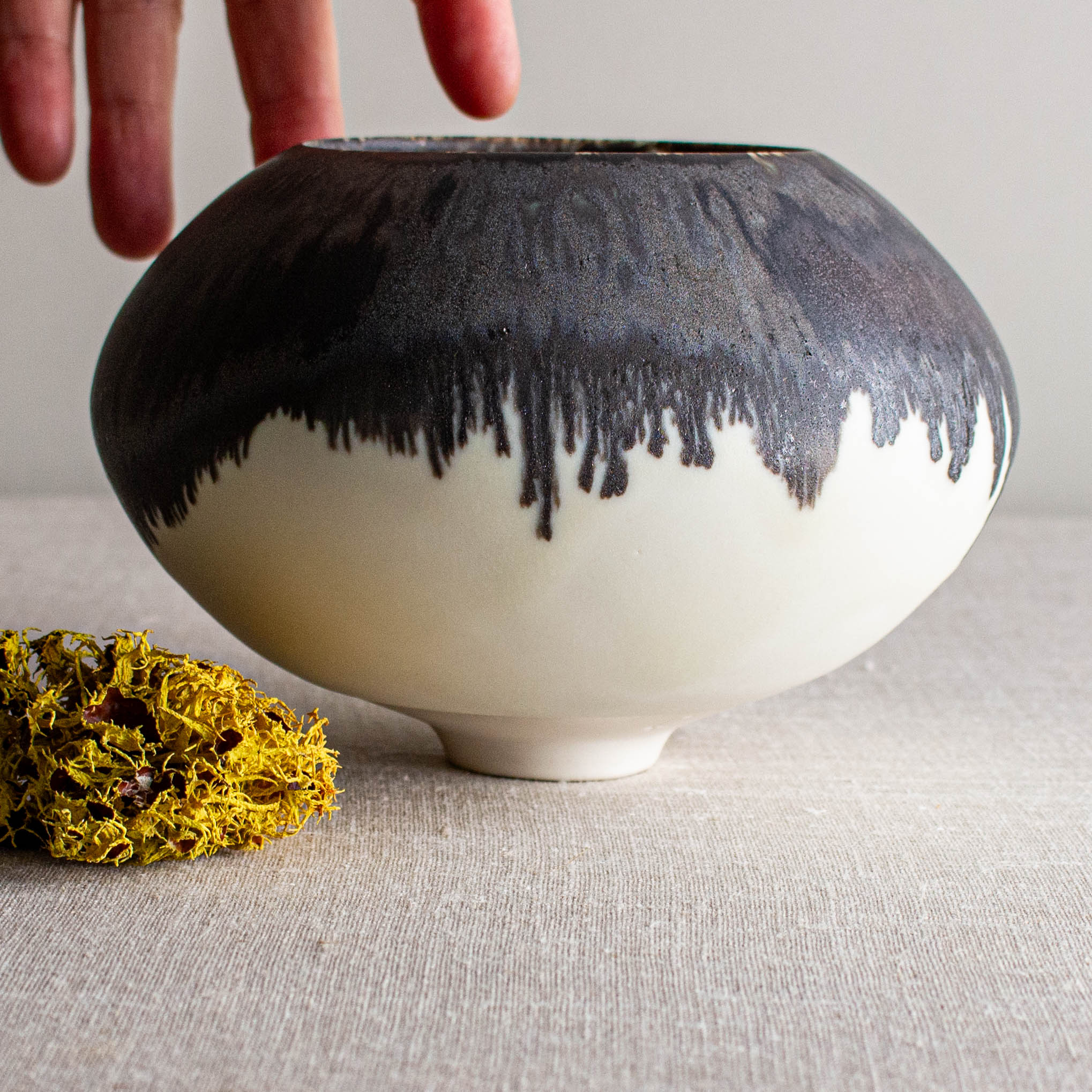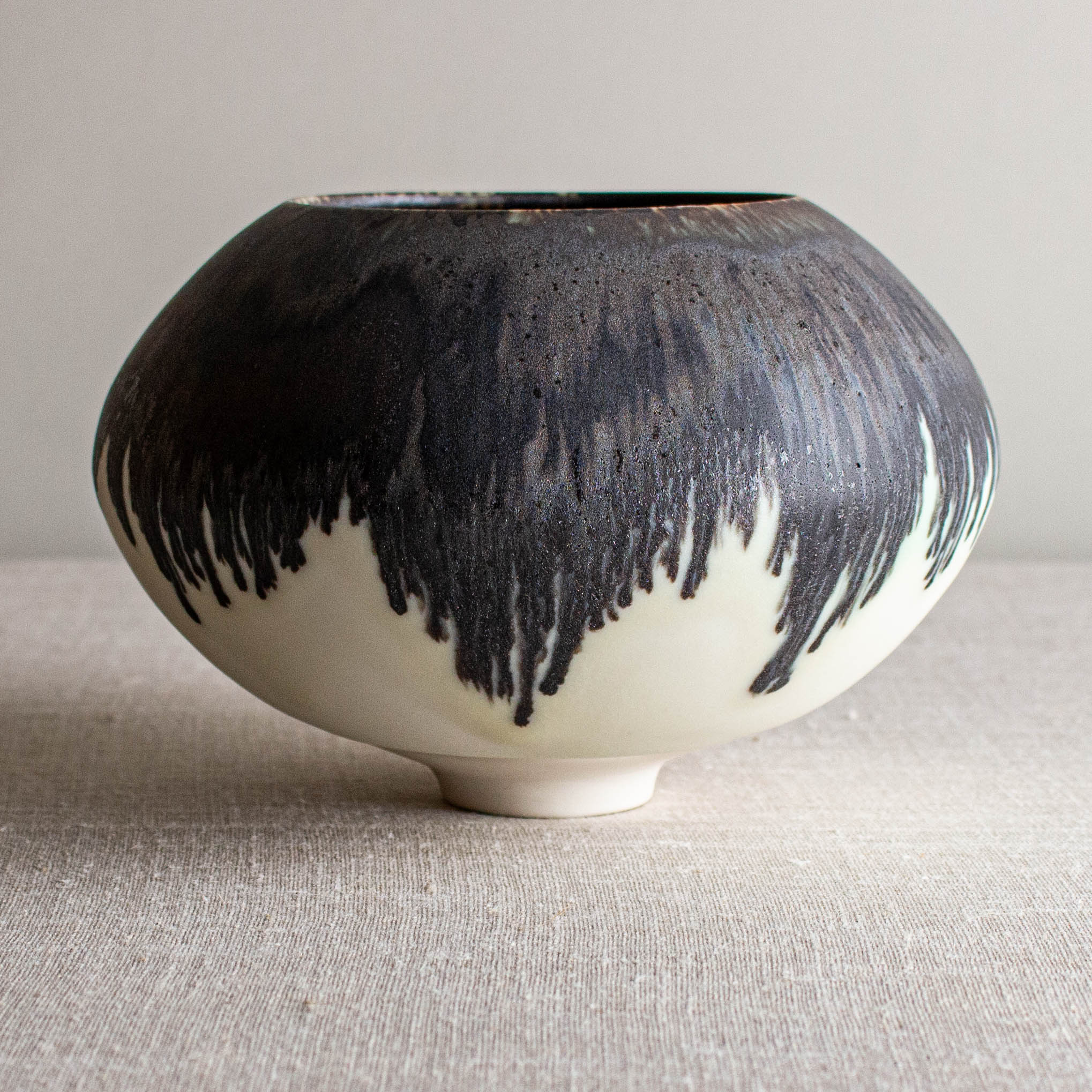 Dripping and dramatic, glazed in my Crystalline White Matte glaze and then the rim is dipped in one of my Bronze glazed. They melt together beautifully at 2300 degrees.