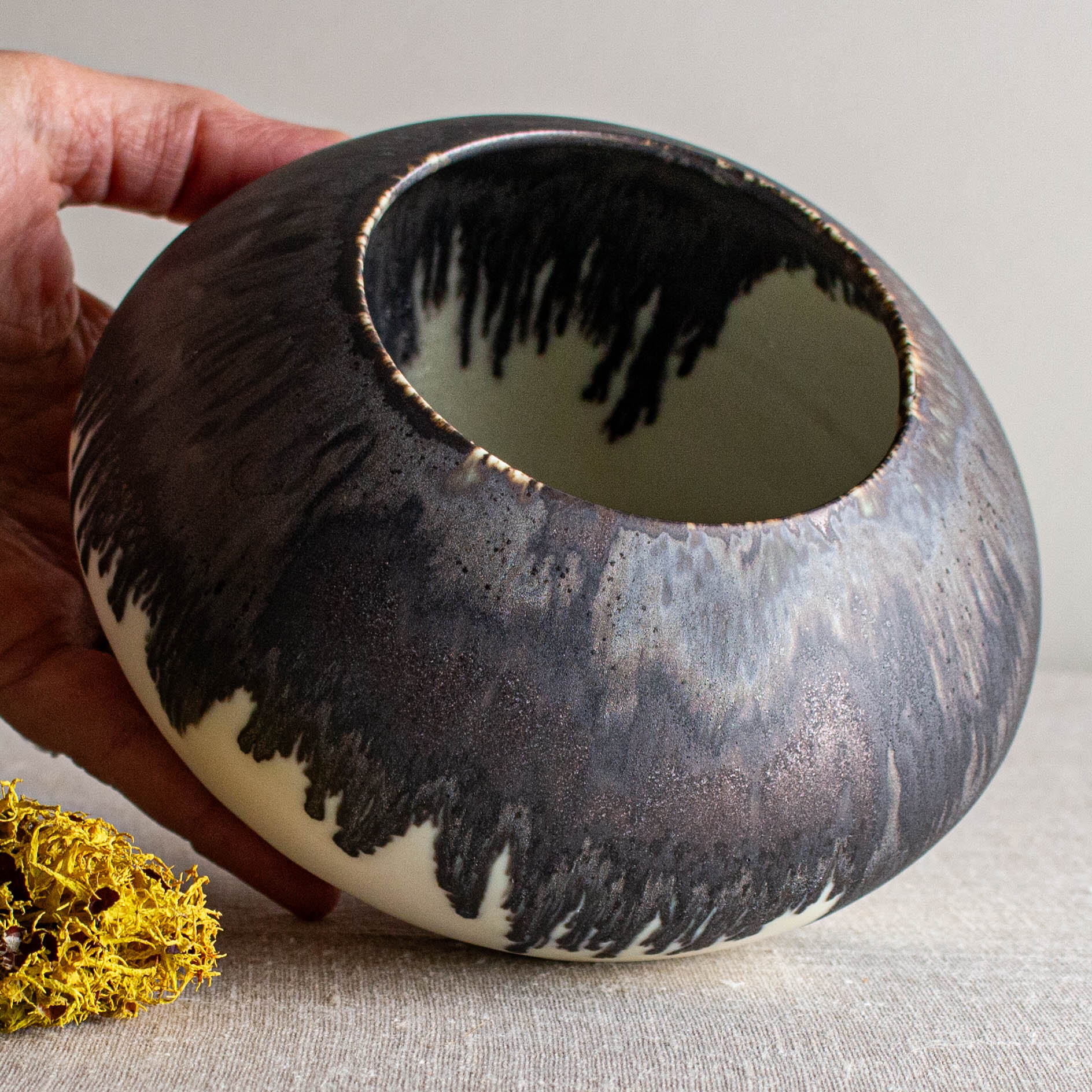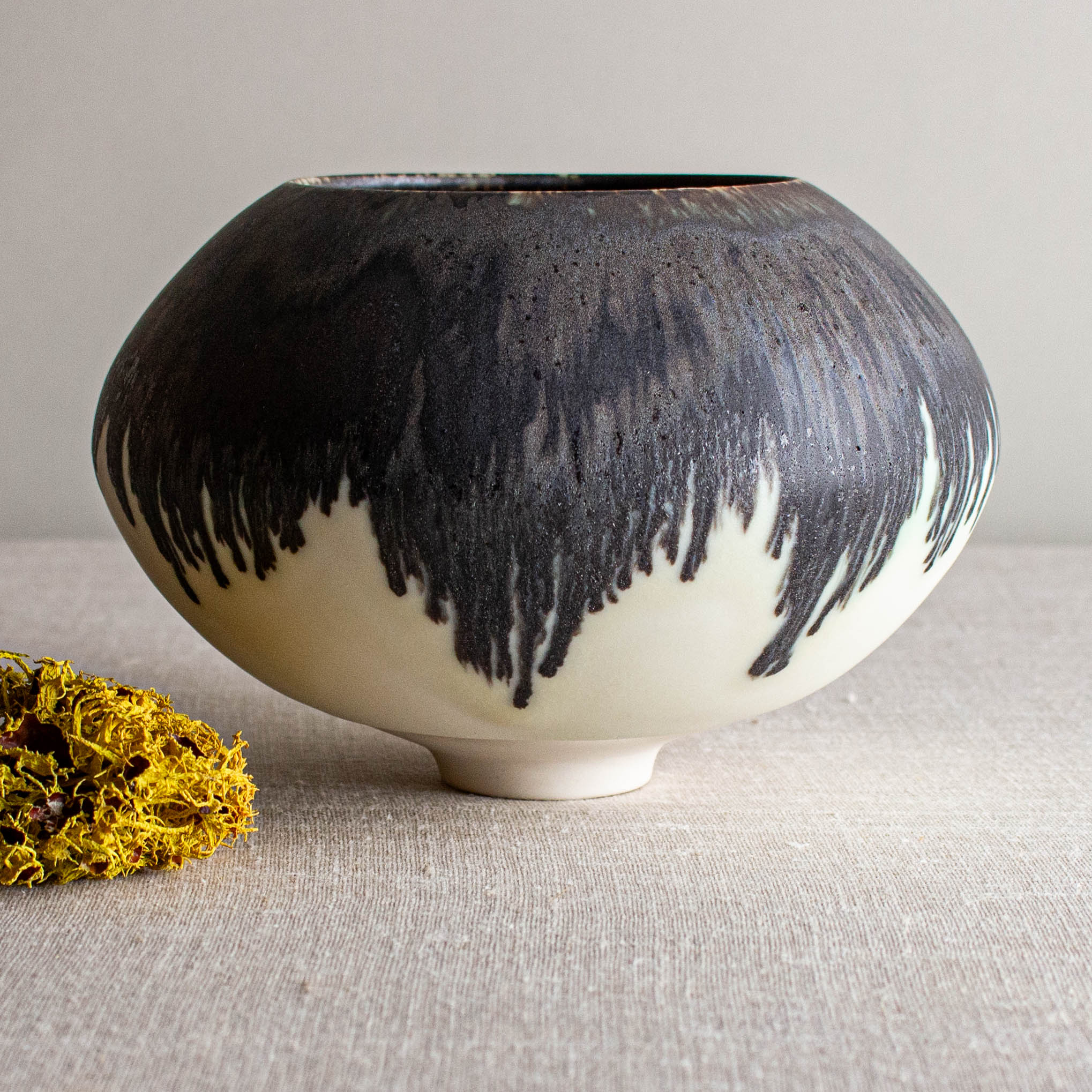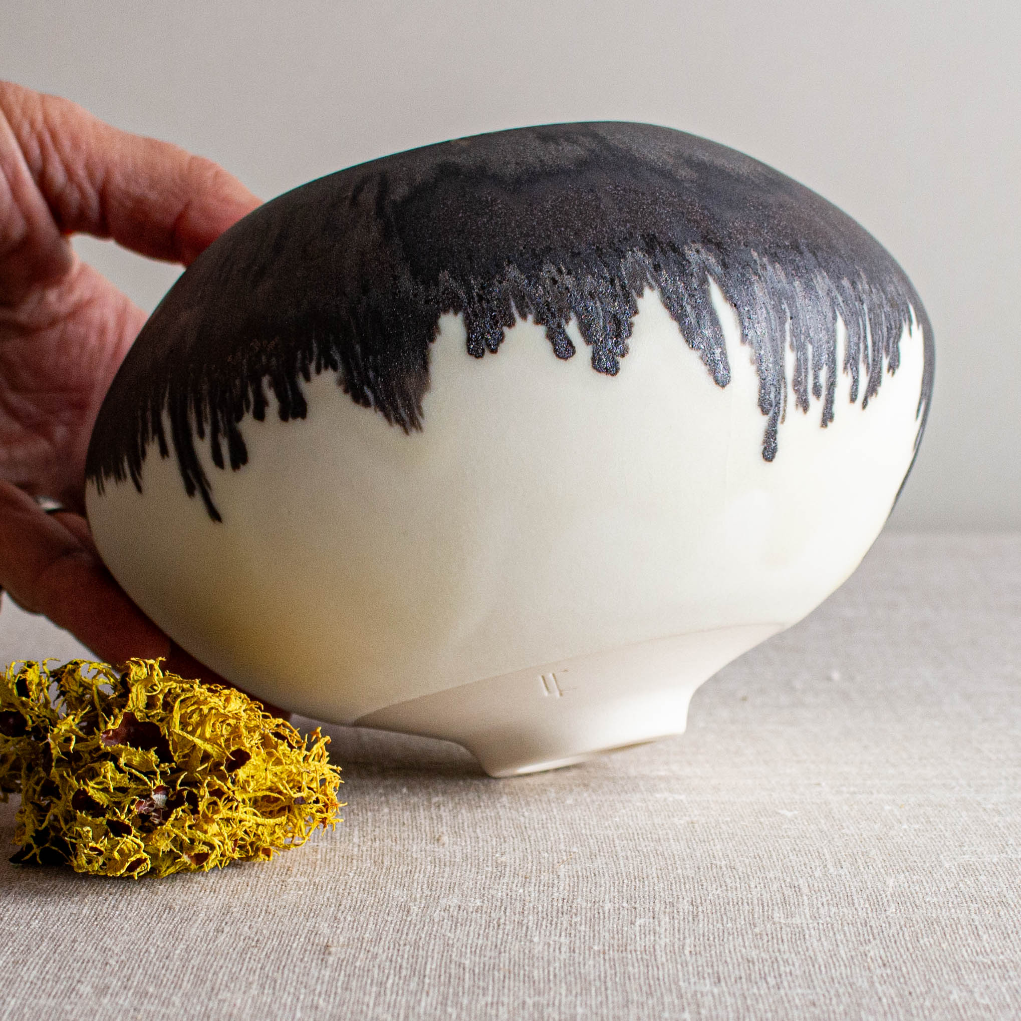 Dripping and dramatic, glazed in my Crystalline White Matte glaze and then the rim is dipped in one of my Bronze glazed. They melt together beautifully at 2300 degrees.