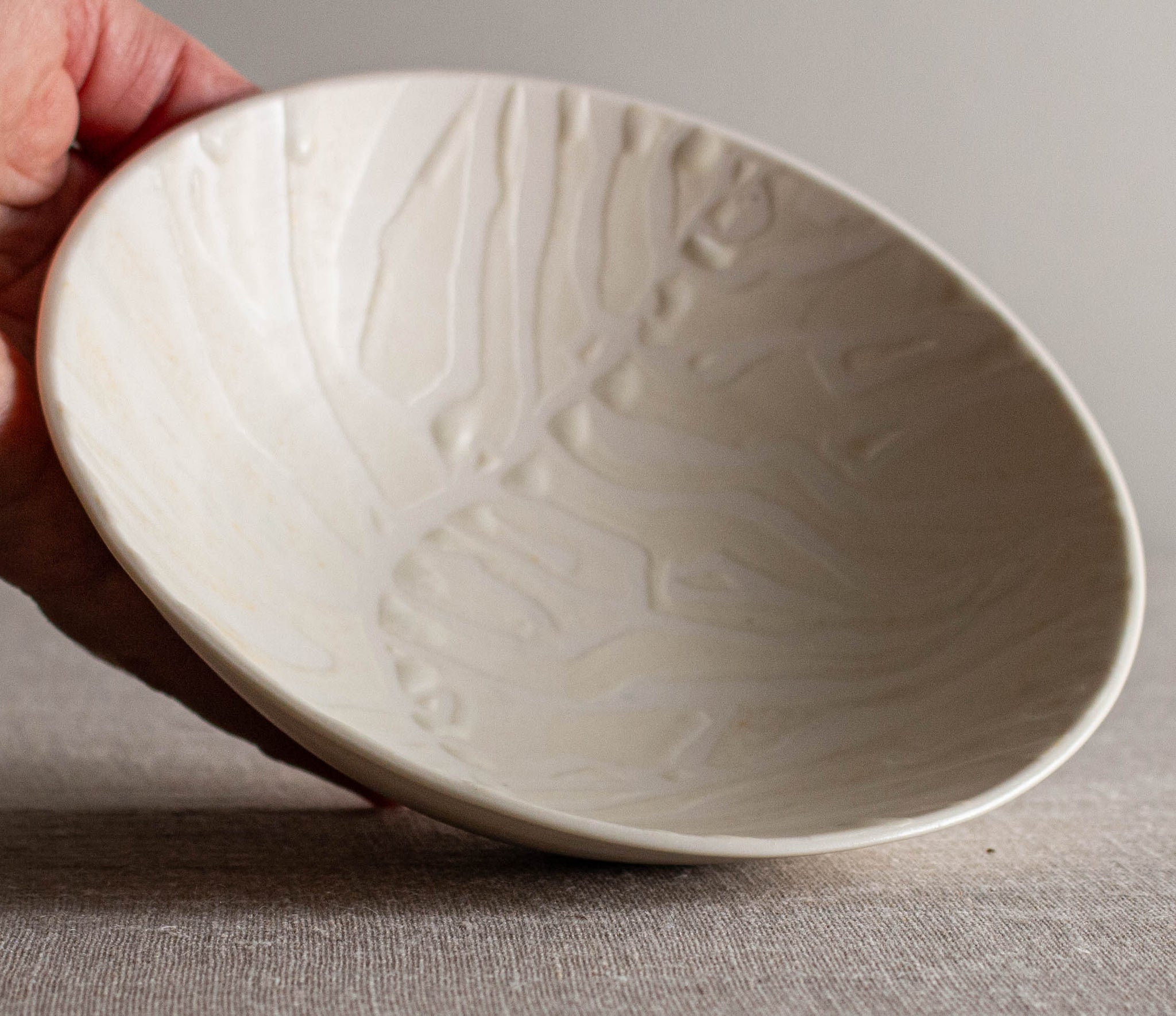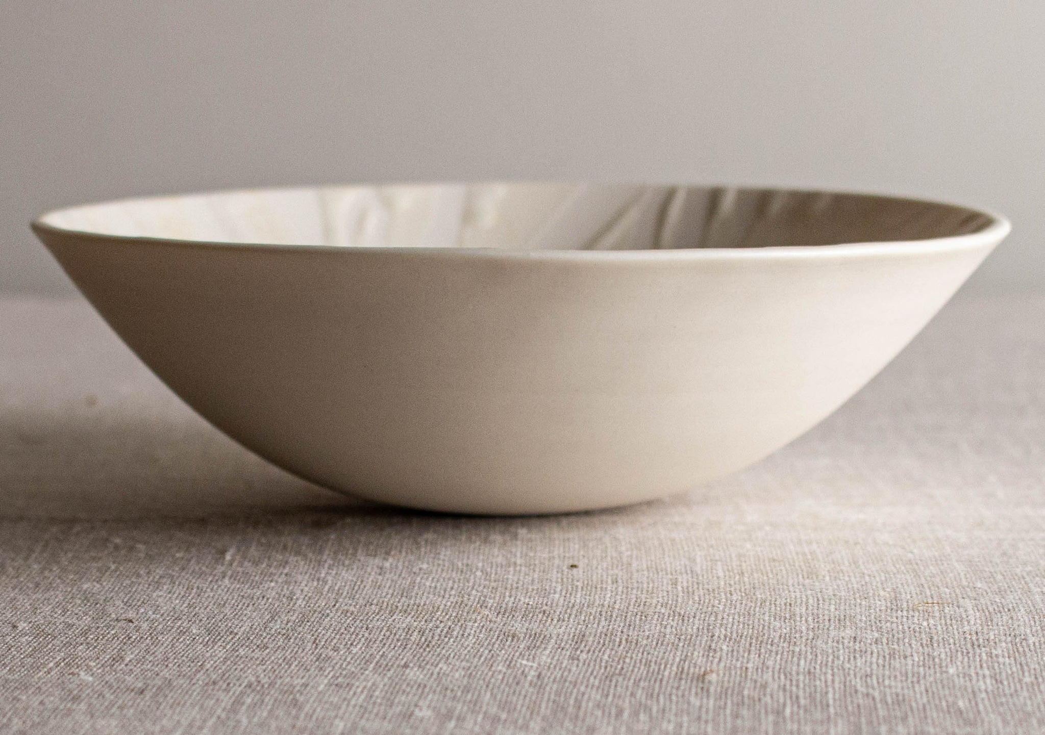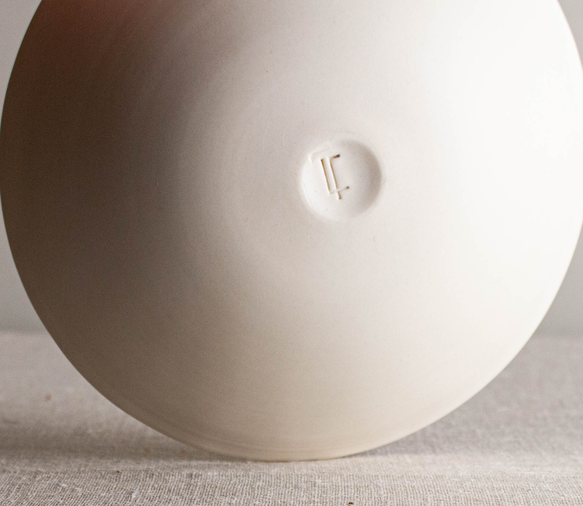 Wheel thrown porcelain vessel with hand painted glaze pattern on the interior. Thin and delicate vessel with a lovely, tiny foot