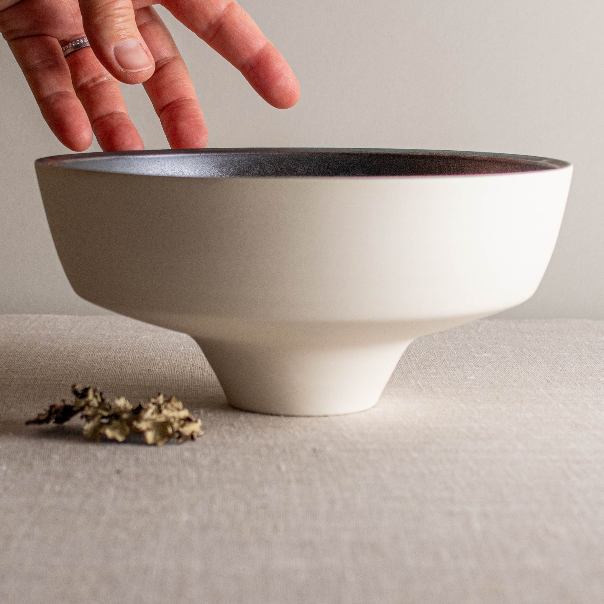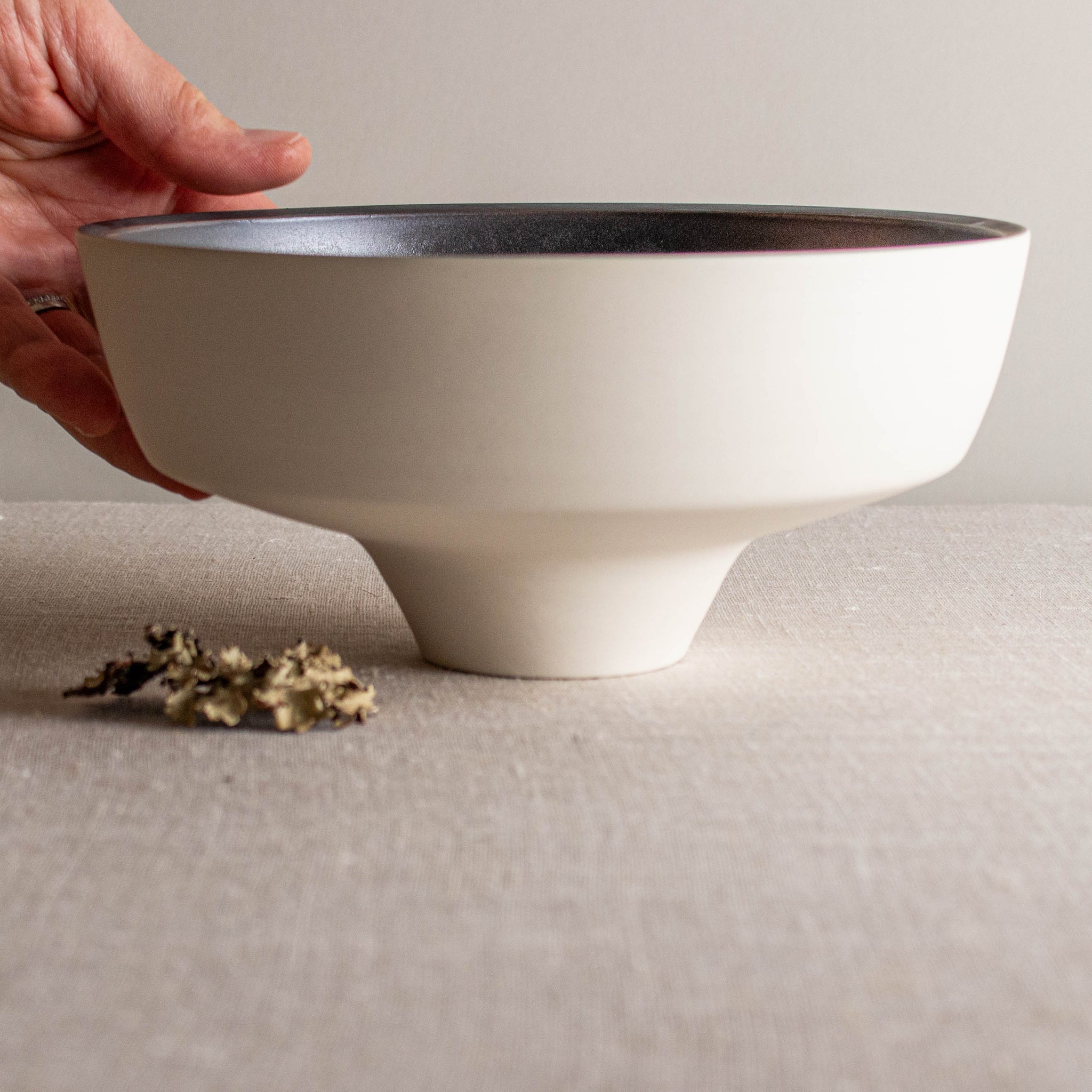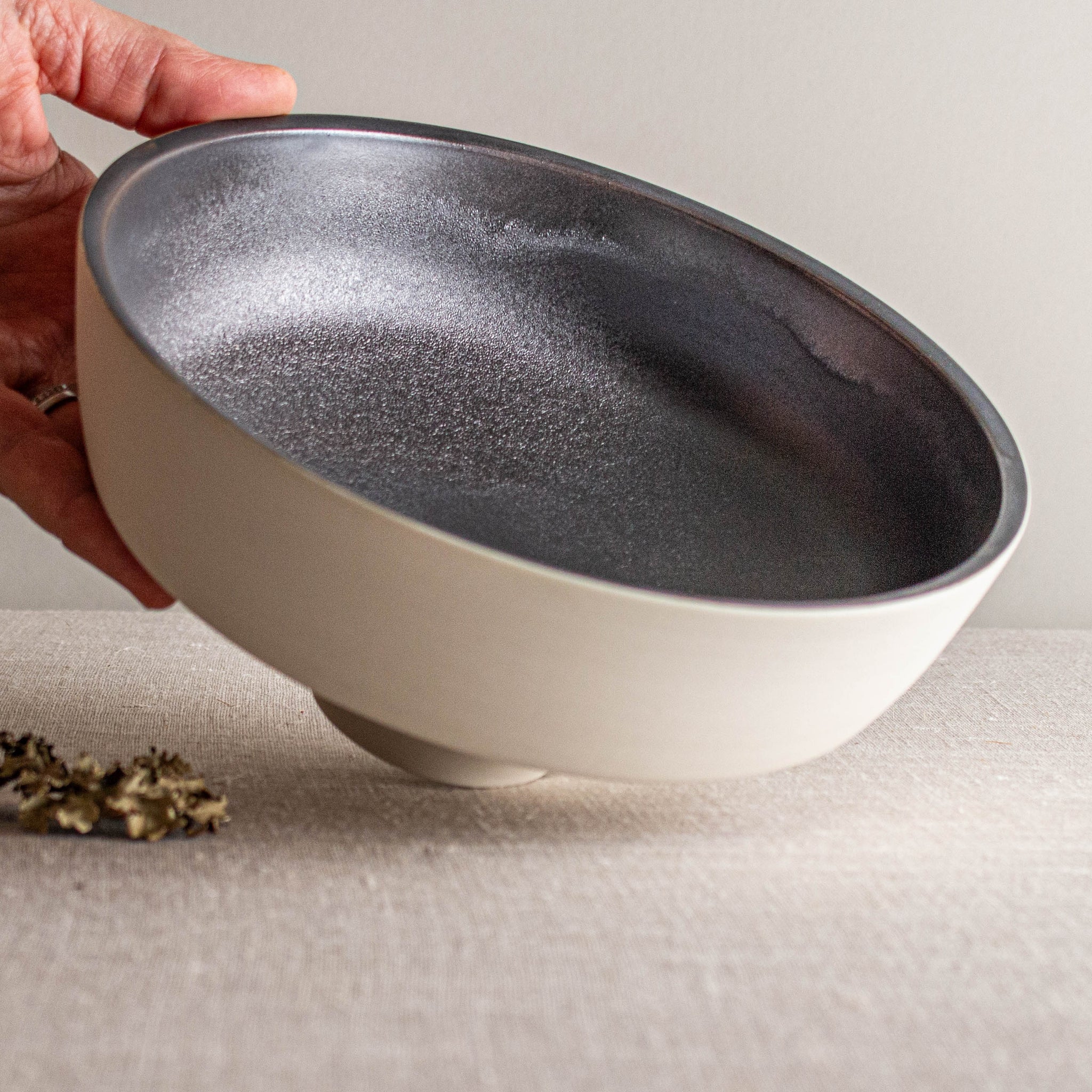 This pieces in glazed on the interior with a textured bronze glaze and has a smooth, white, bare porcelain exterior.