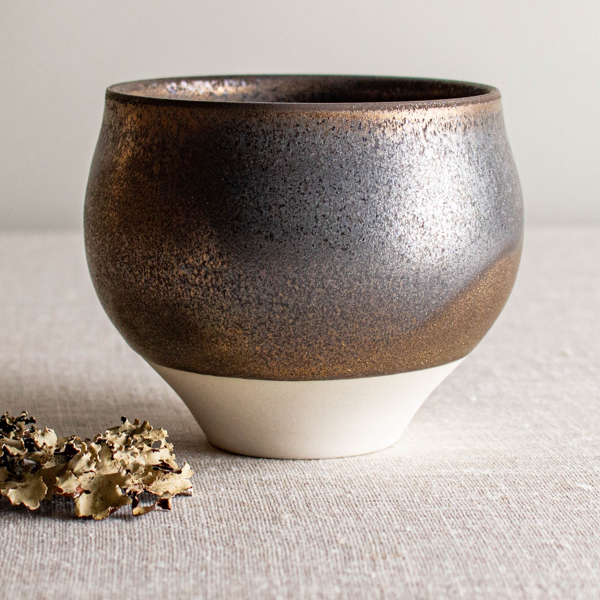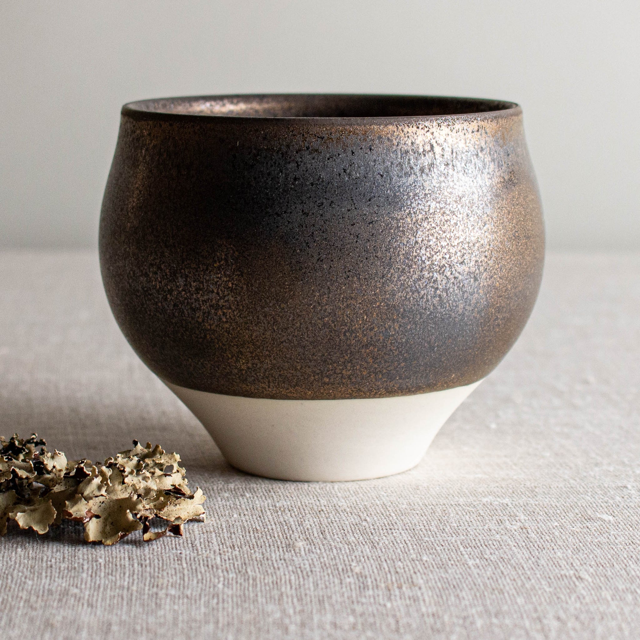 Wheel thrown porcelain, glazed inside and out with Oil Spot Bronze Glaze.
