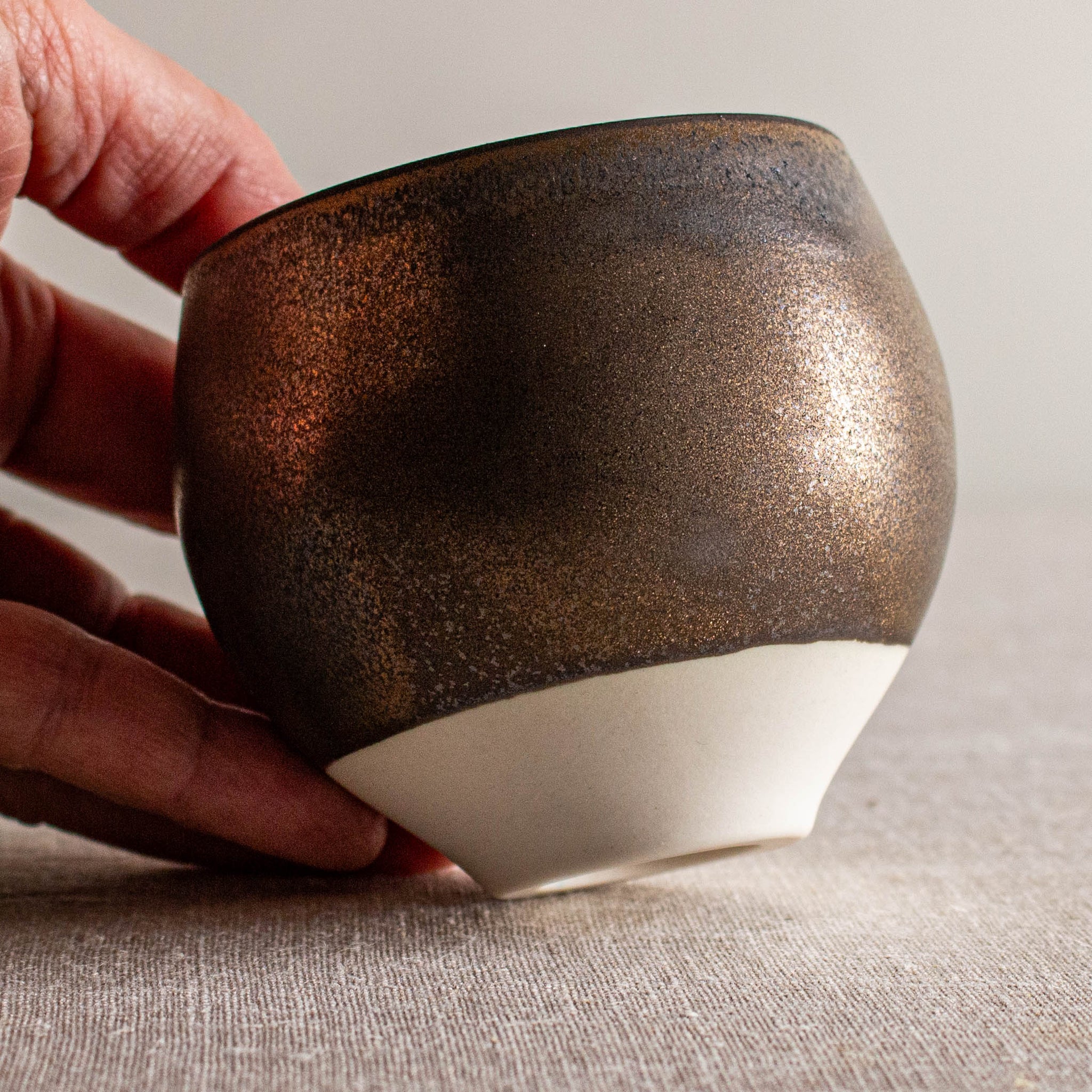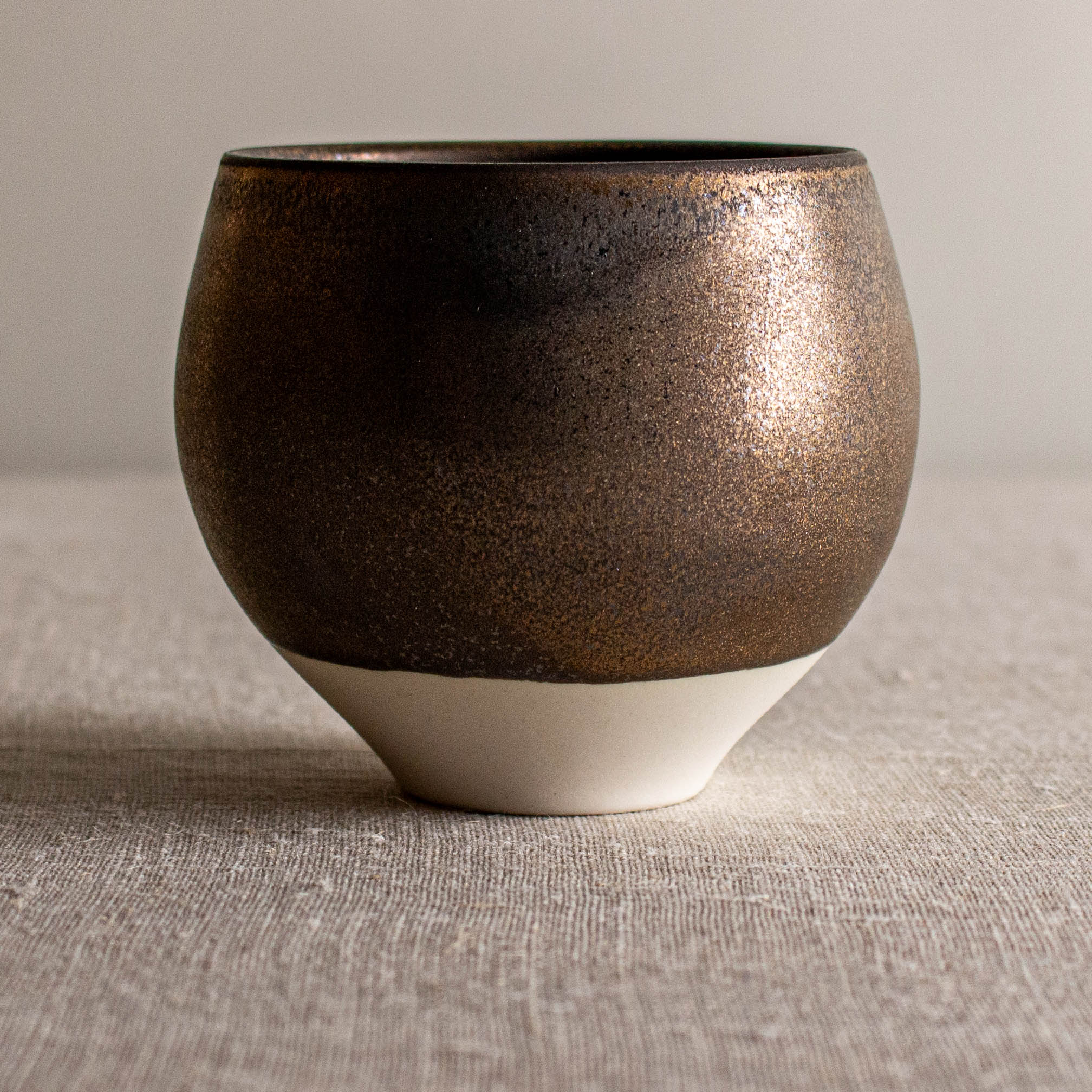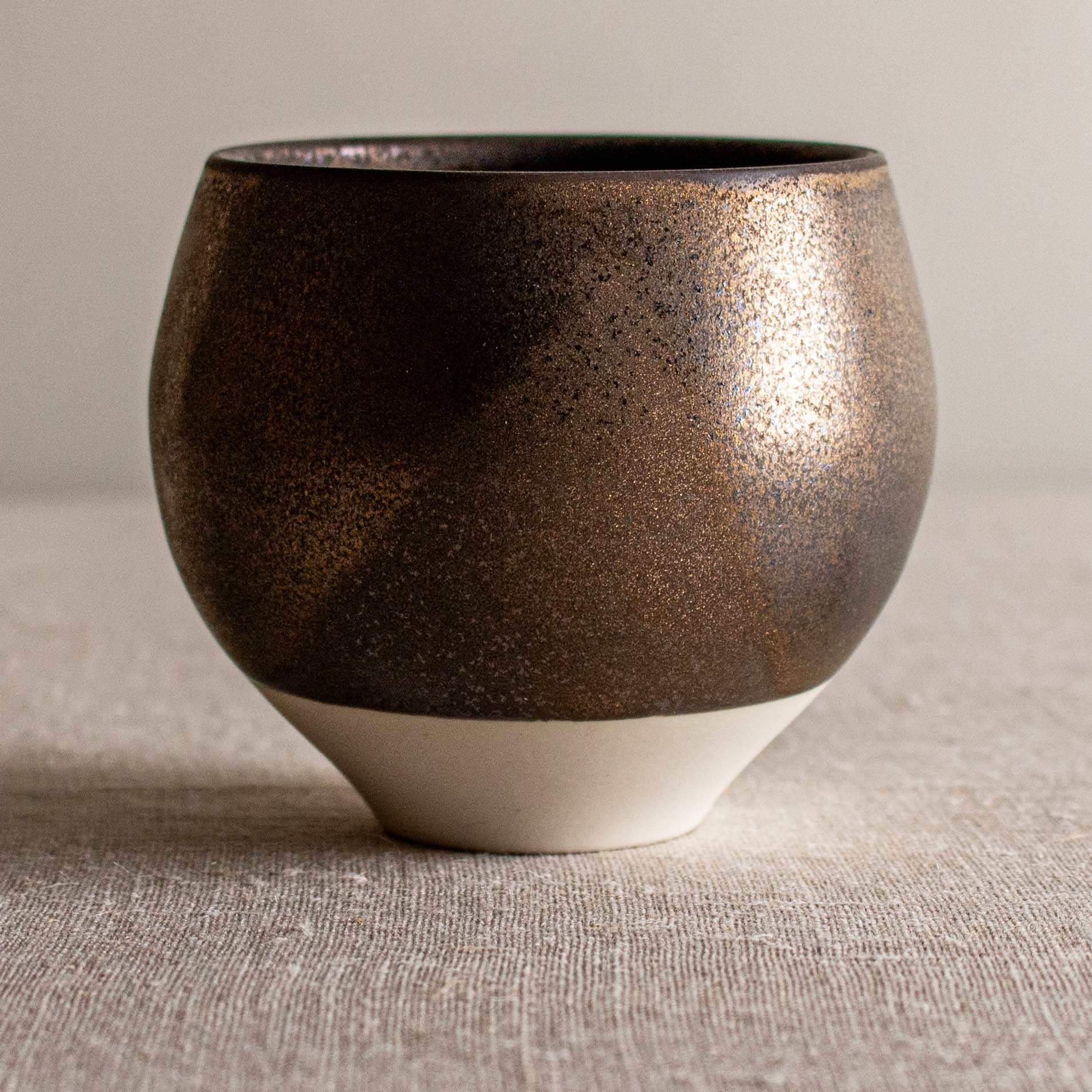 Wheel thrown form glazed in my studio made Oil Spot Bronze inside and out