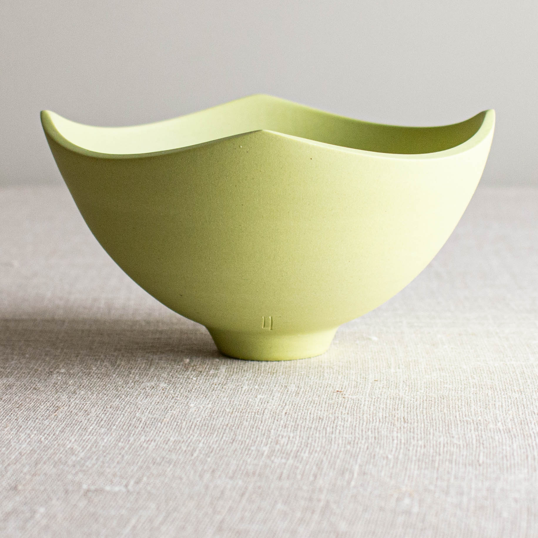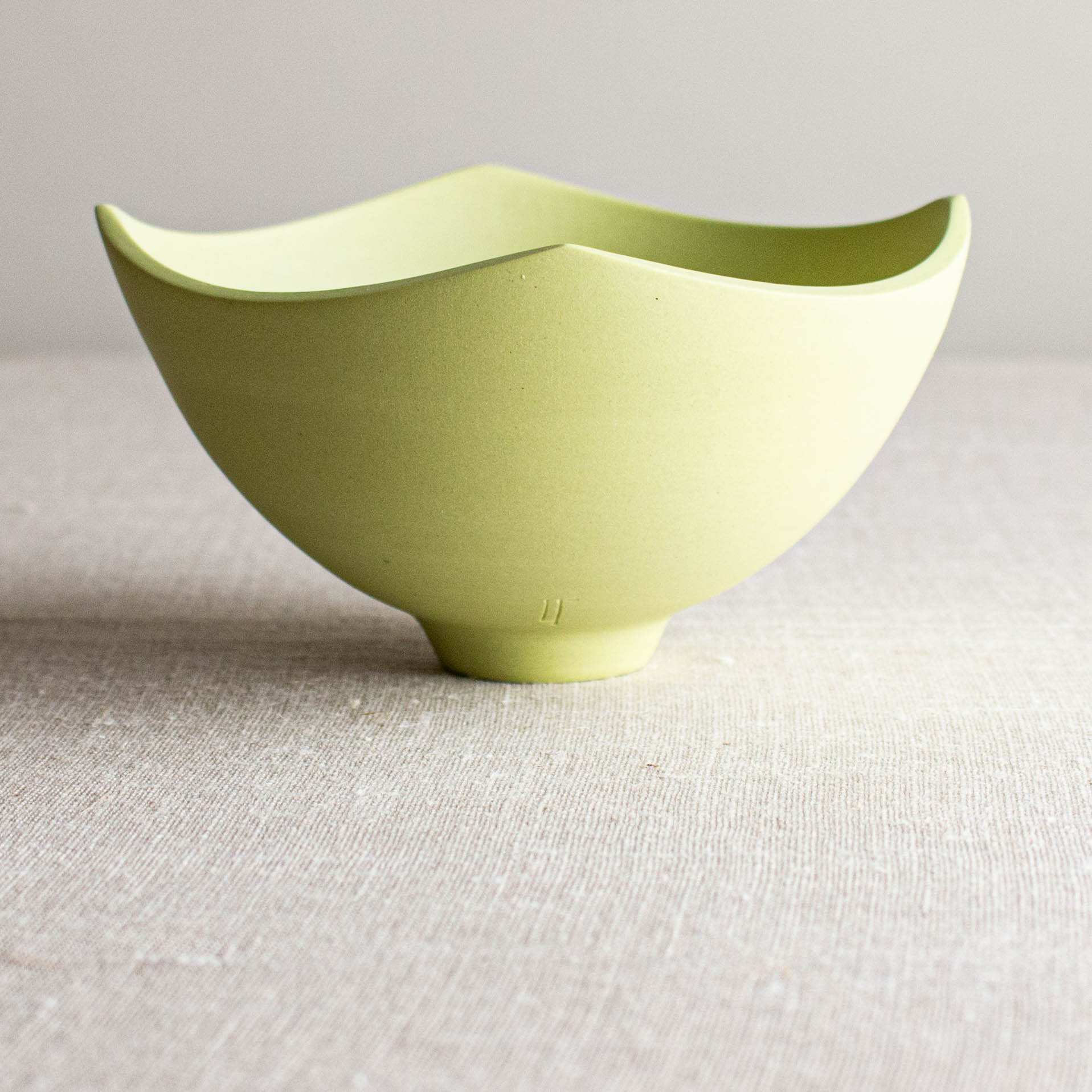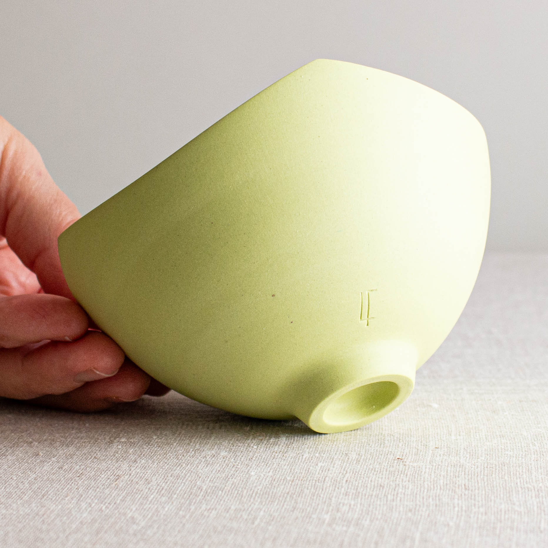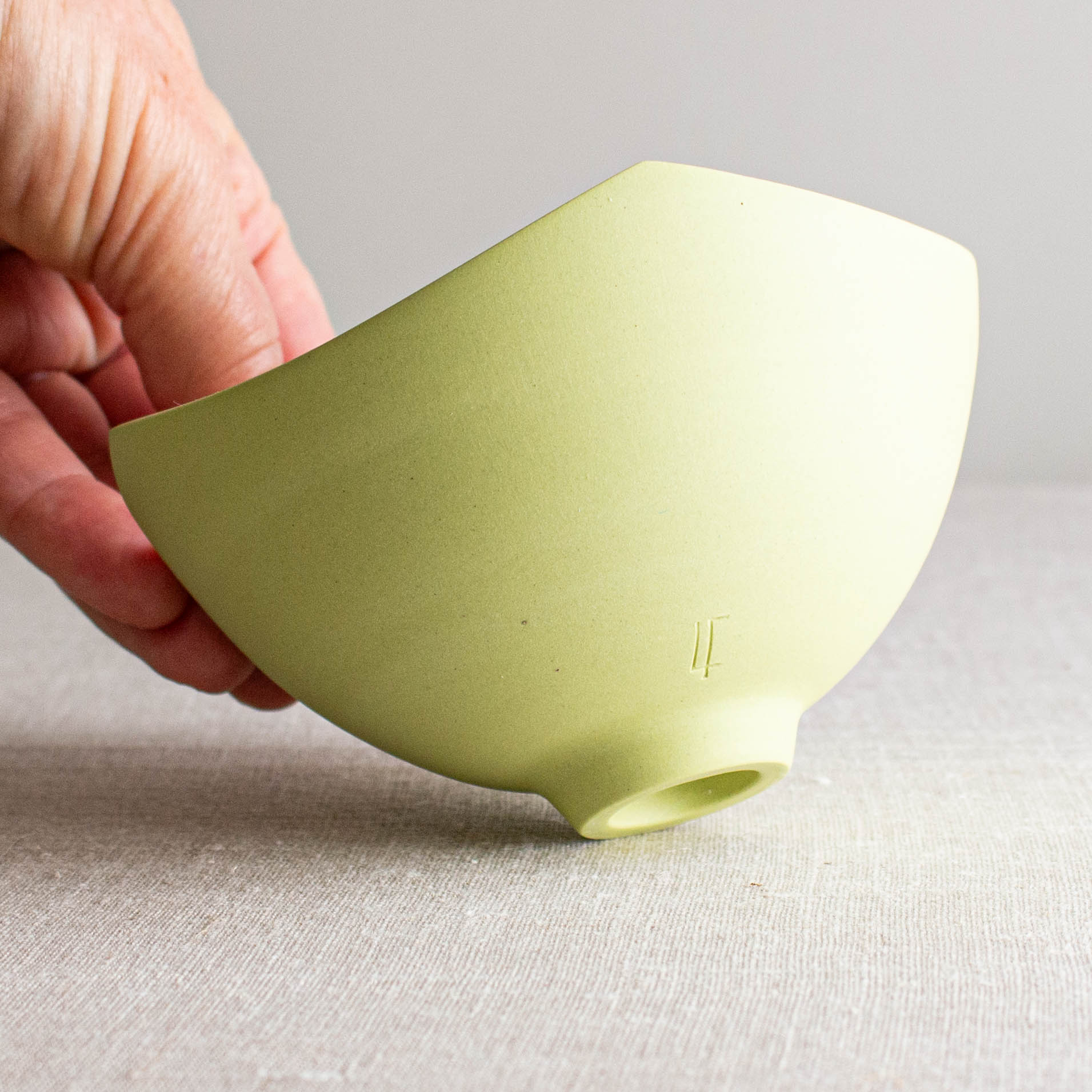Chartreuse colored porcelain, made in my studio from recycled trimmings and mason stain. Wheel thrown and unglazed. Smooth, matte and glowing surface.
