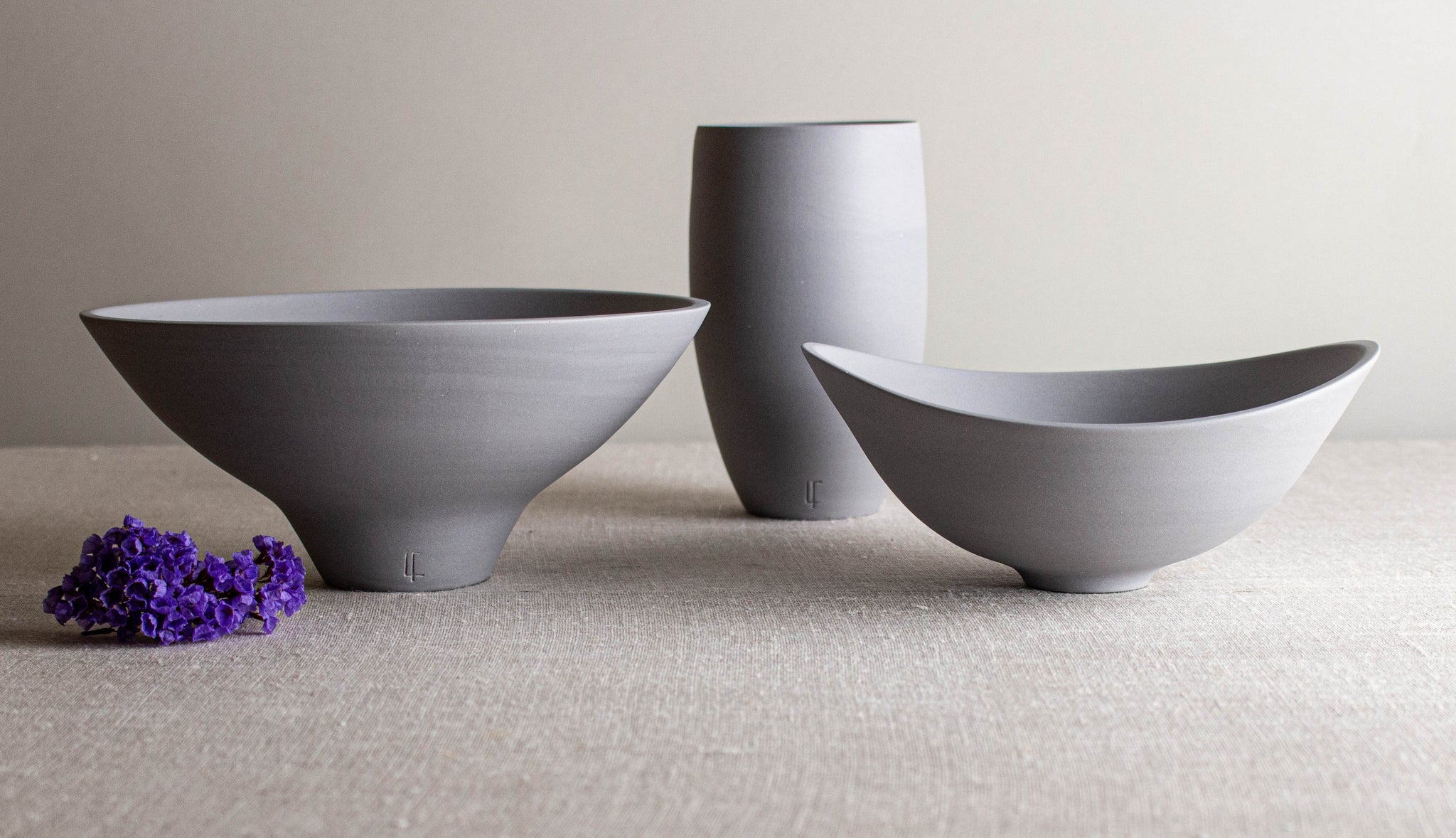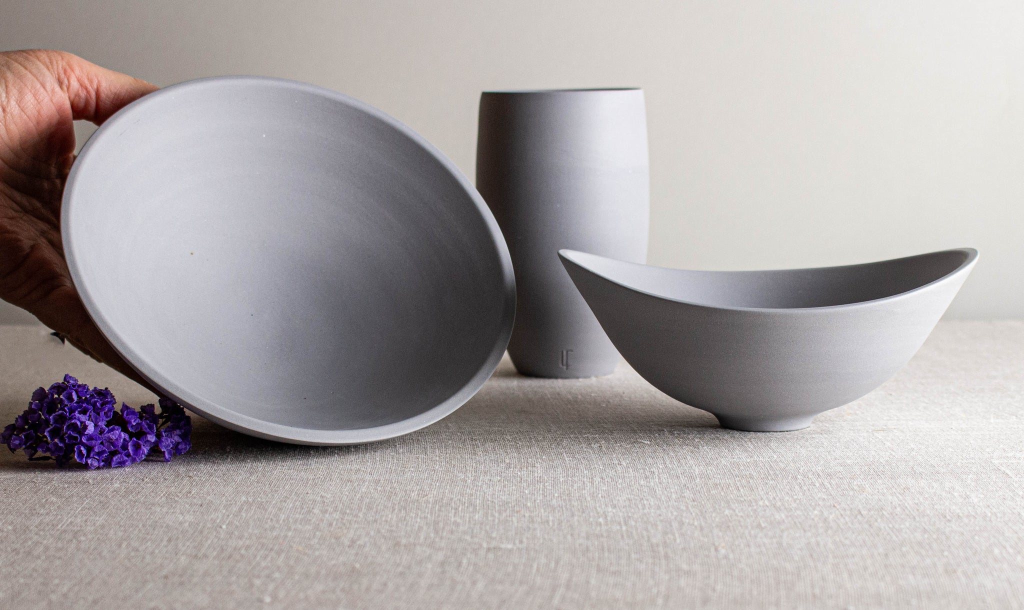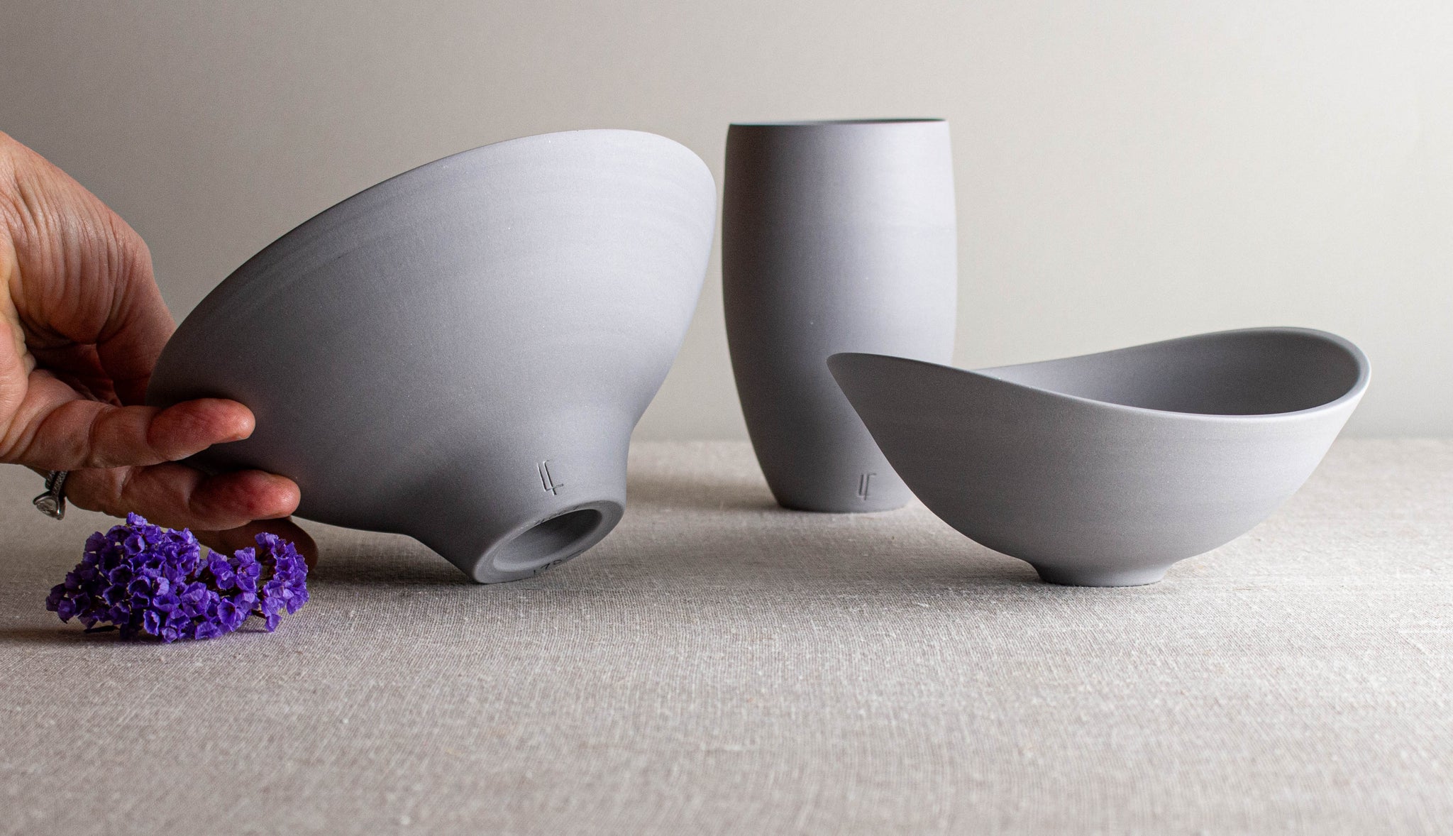 Light grey colored porcelain vessels, unglazed, smooth and matte