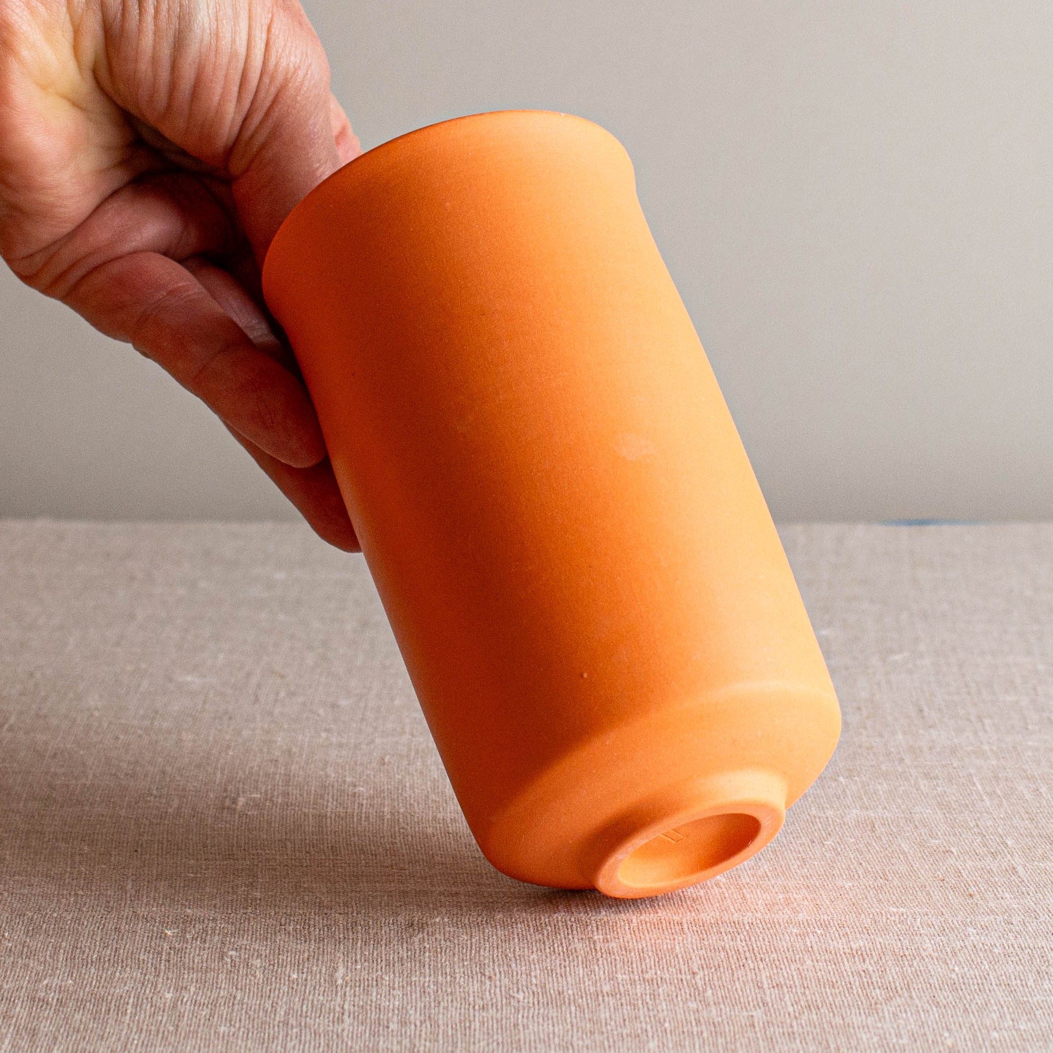 Orange colored porcelain, made in my studio from recycled trimmings and mason stain. Wheel thrown and unglazed. Smooth, matte and glowing surface.