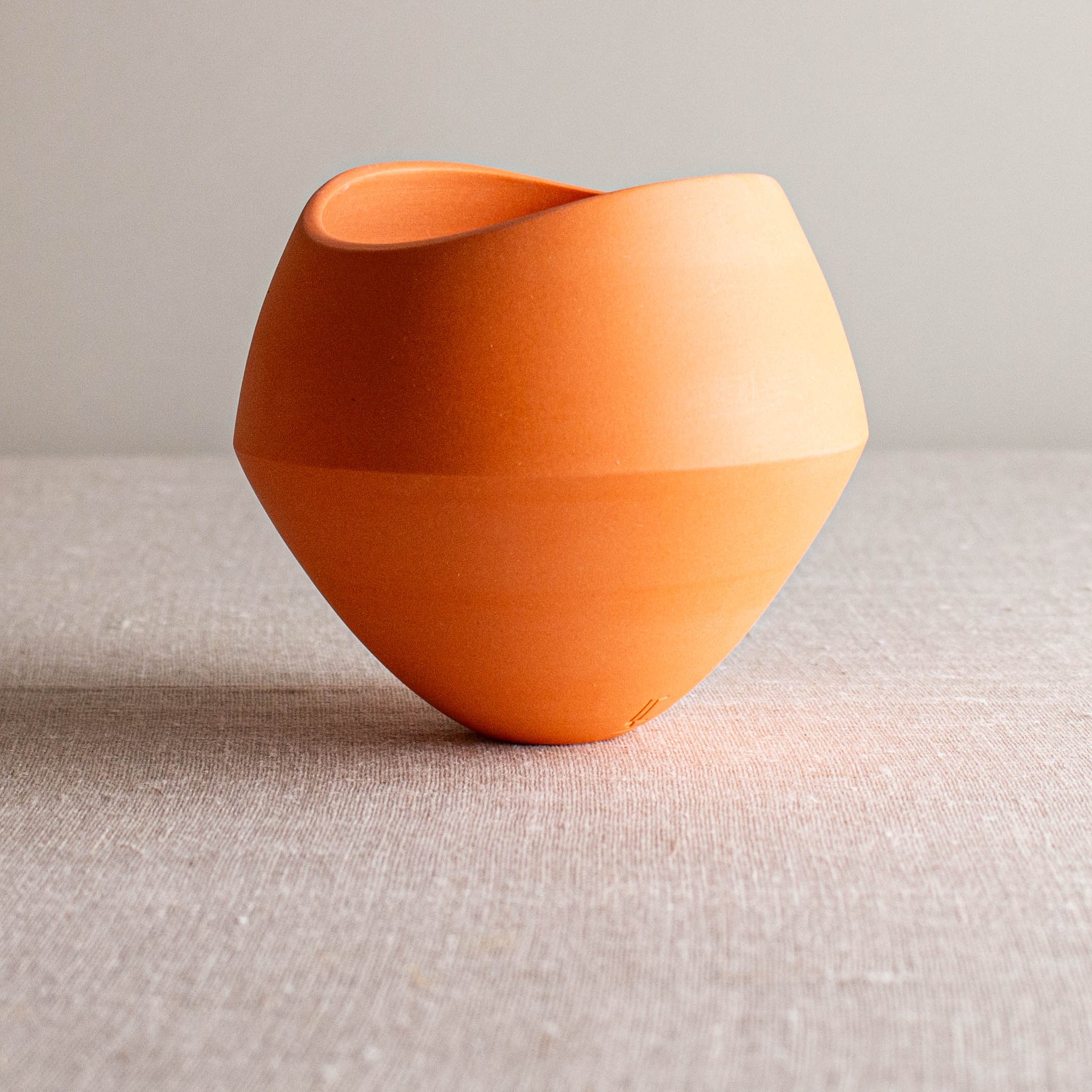Orange colored porcelain, made in my studio from recycled trimmings and mason stain. Wheel thrown and unglazed. Smooth, matte and glowing surface.