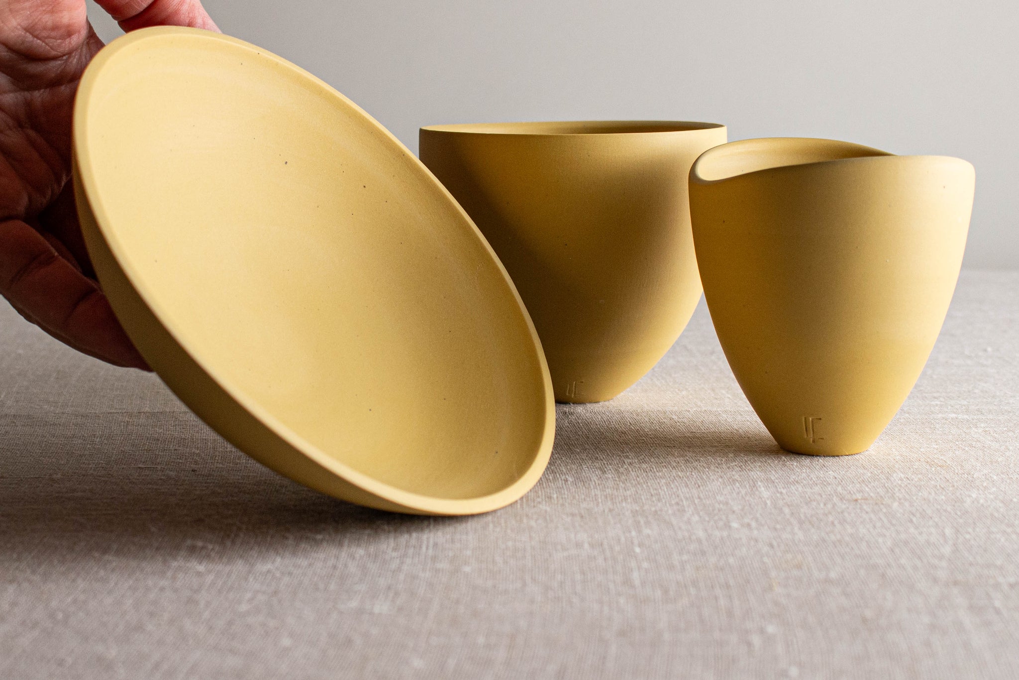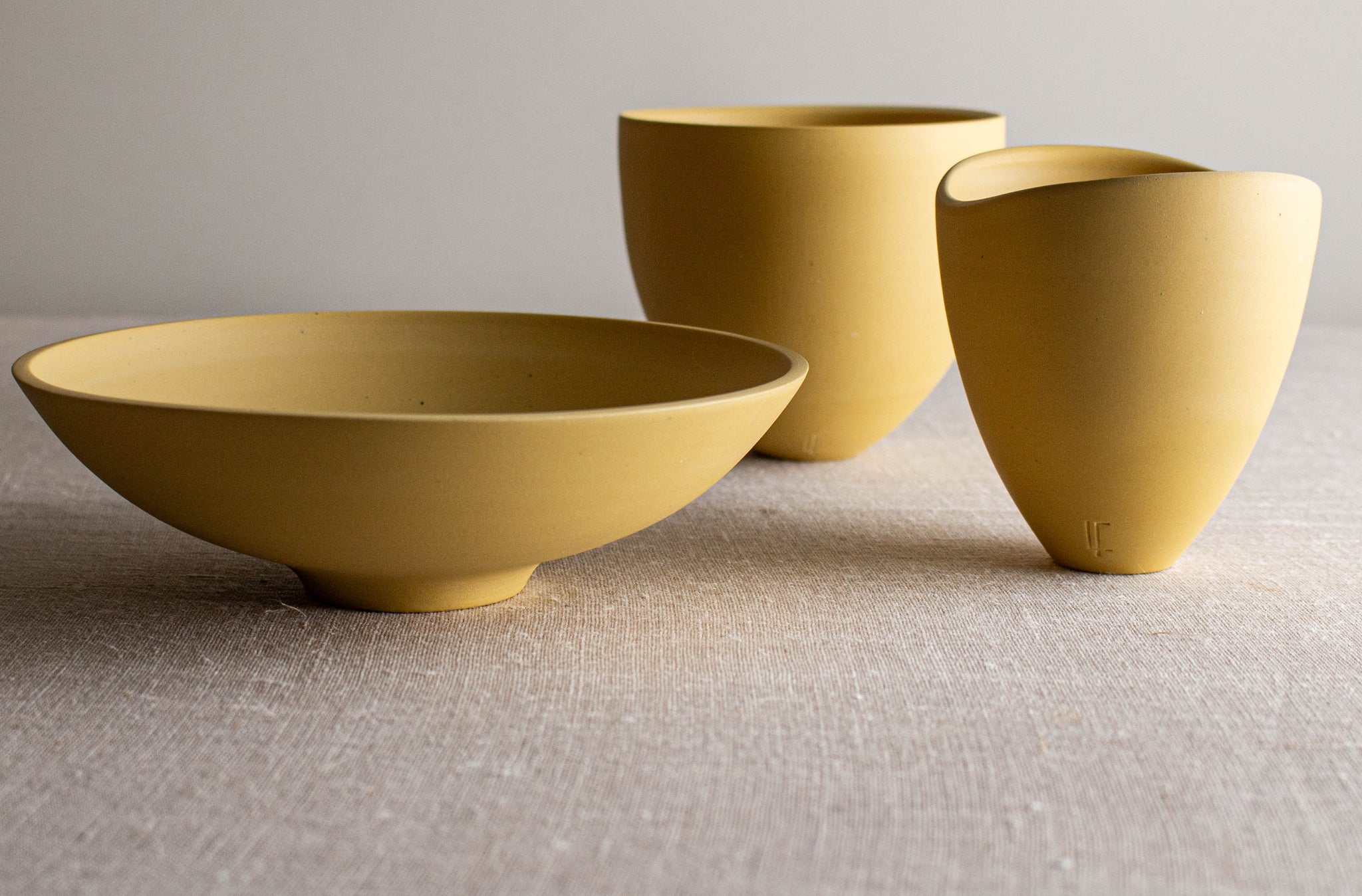 Wheel thrown vessels made of colored porcelain, no glaze, just the smooth glowing surface of the porcelain. each is one of a kind
