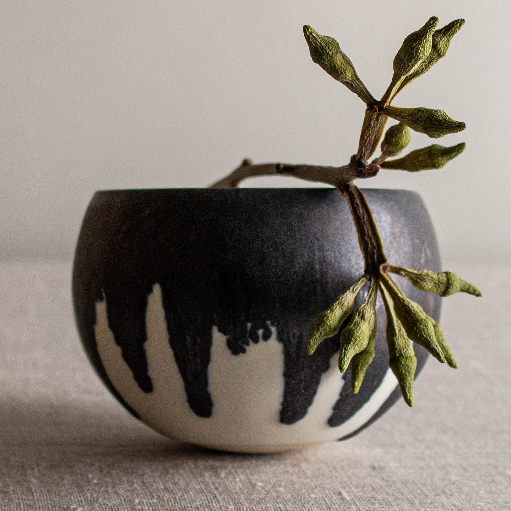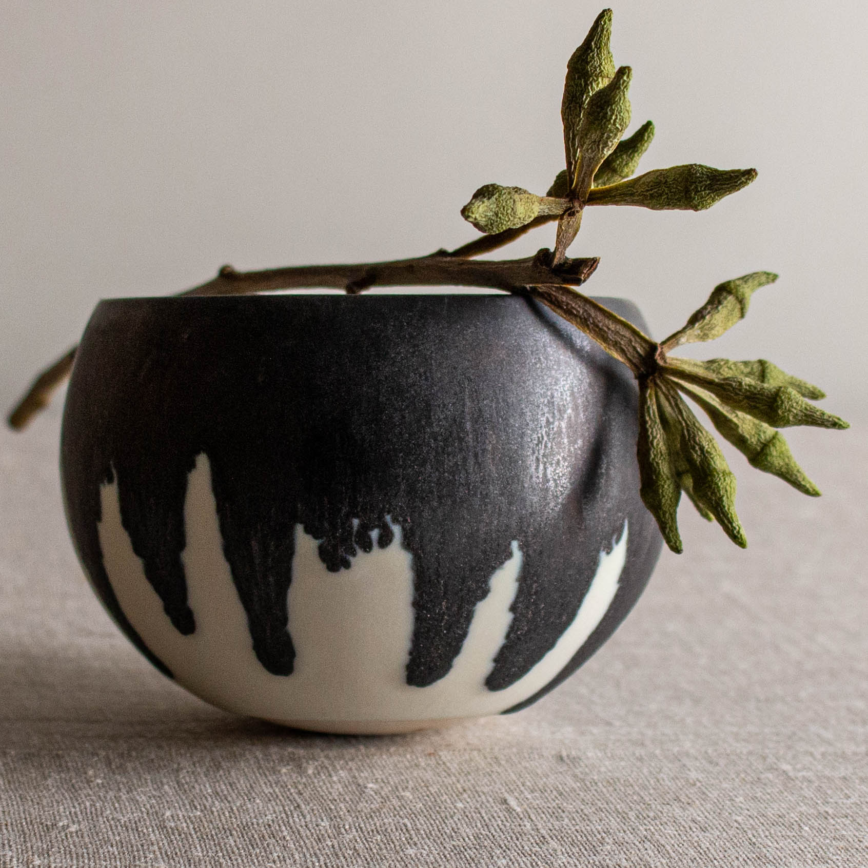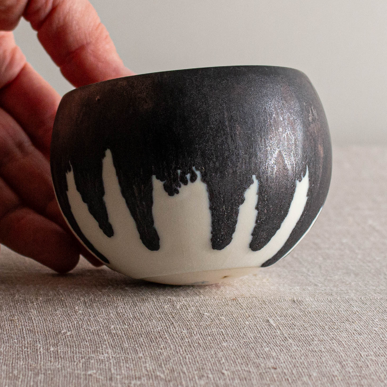 Glazed in Crystalline Matte White and a dip of dramatic Bronze at the rim