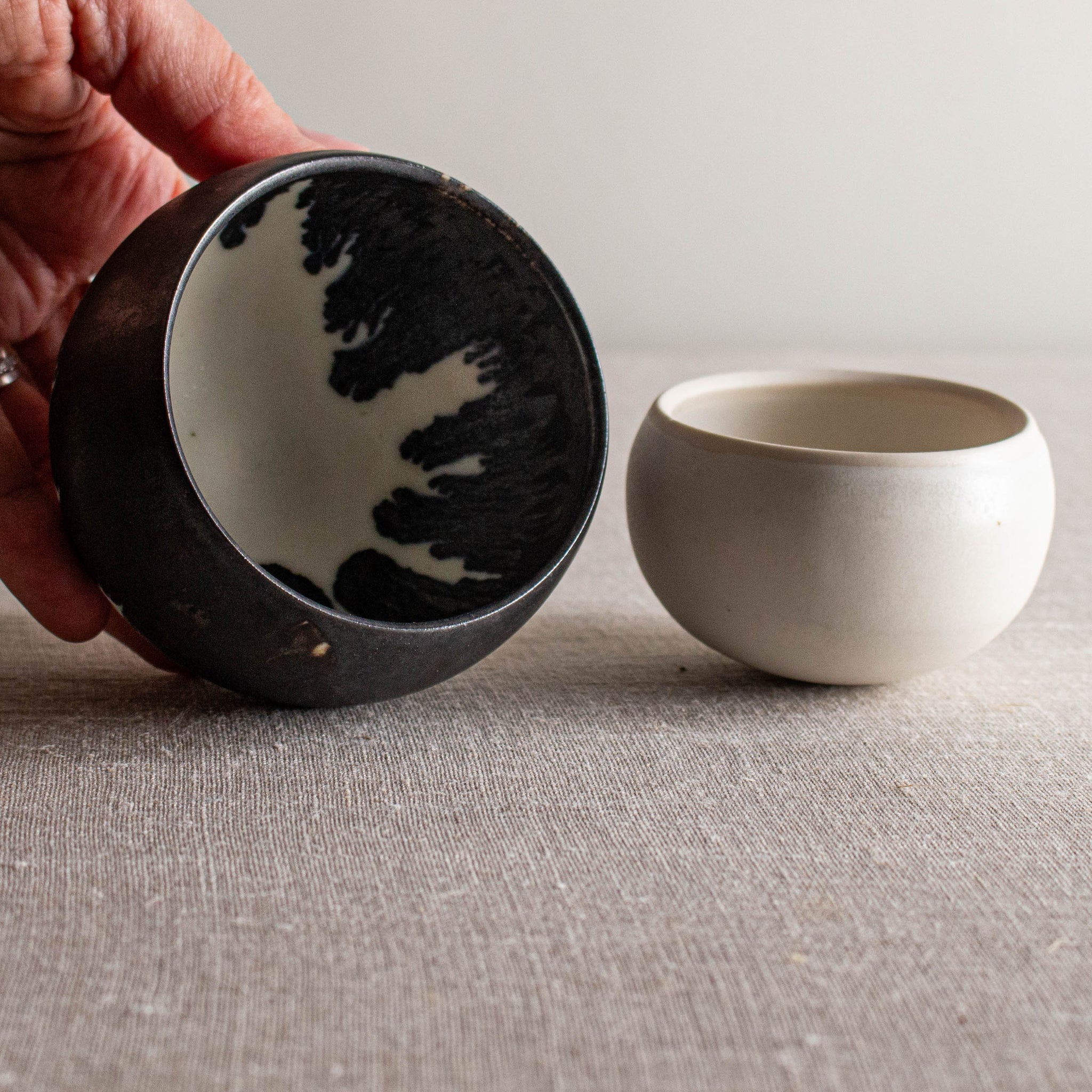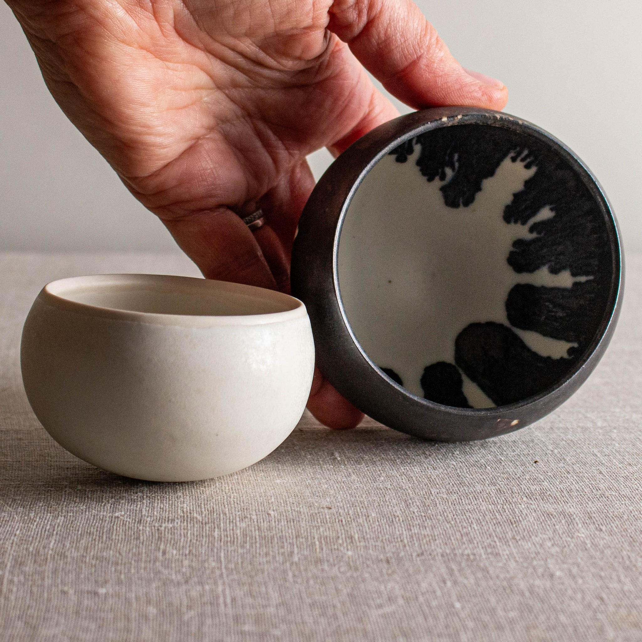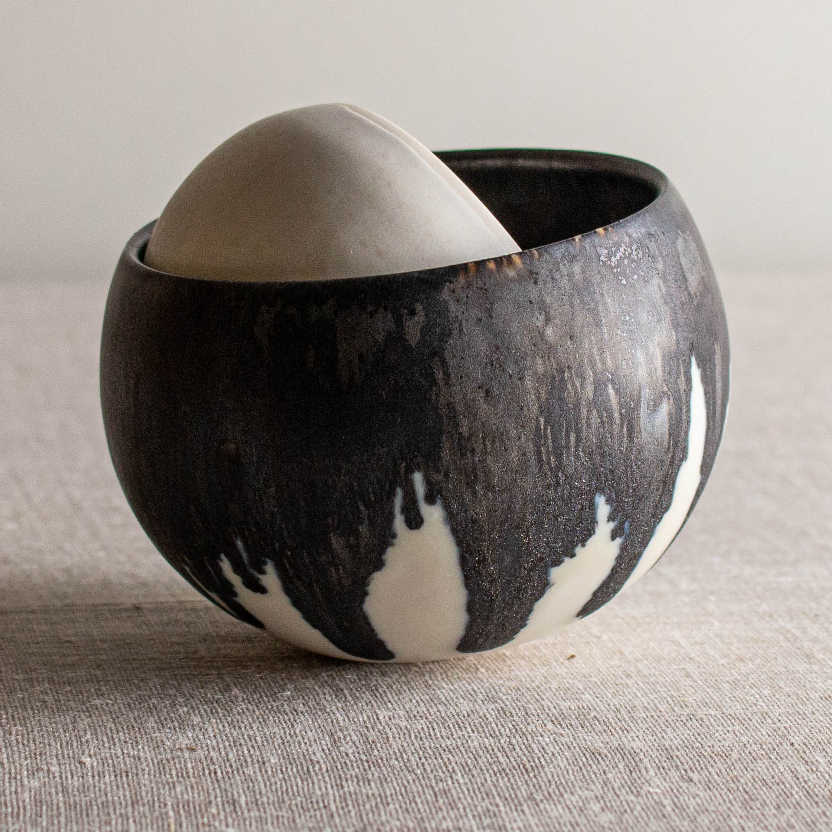 Glazed in Crystalline Matte White and a dip of dramatic Bronze at the rim