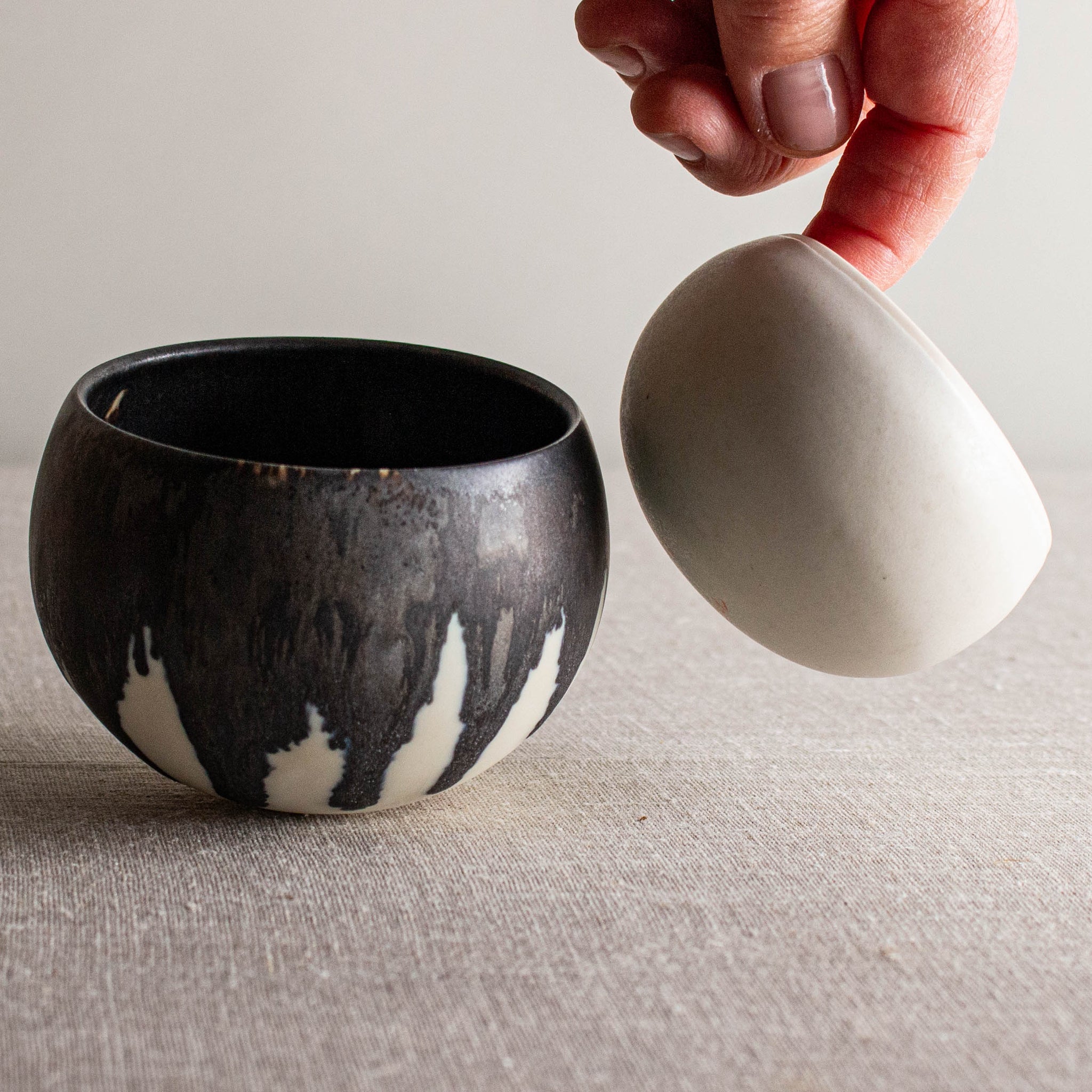 Set of 2 pieces that nest, or not, up to you. Rounded bottom allows them to 'wobble' if you touch lightly